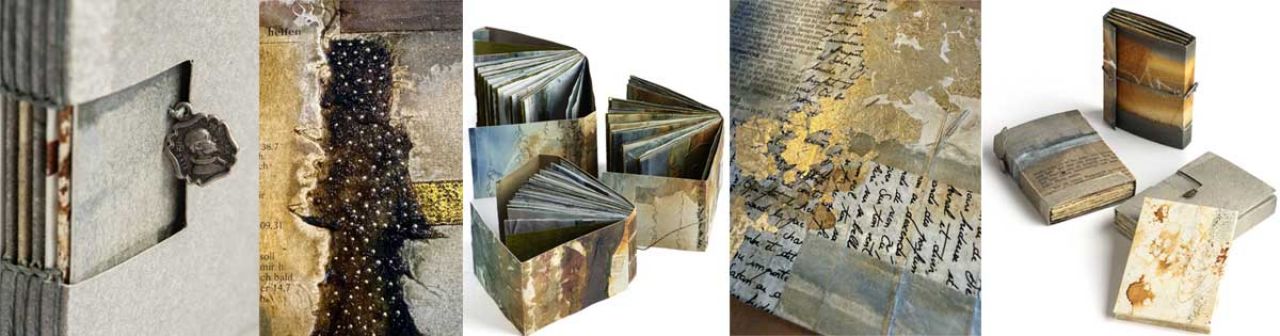 In diesem Kurs erlernen wir verschiedene Techniken der Collage sowie Vergoldungsverfahren. Sie sollen hier der Herstellung einer Minibibliothek dienen. Der Kurs umfasst die vier Bindungsarten Leporello, Librello und zwei kleberlose Bindungen. Die Teilnehmer können ihre gestalterischen Fähigkeiten ausbauen und individuelle, künstlerische Objekte schaffen. Durch das Kombinieren von Collage- Elementen und Bindungstechniken entsteht eine außergewöhnliche Minibibliothek, die sowohl ästhetisch ansprechend als auch funktional ist. Die Woche bietet viel Zeit und Raum für eigene kreative Prozesse. Ideen können in Ruhe wachsen, erprobt und weiterentwickelt werden.