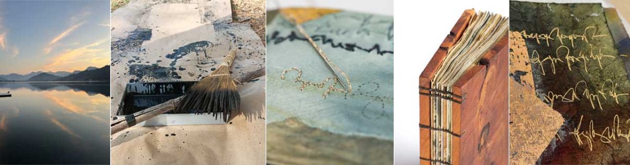 Wir beginnen unser Tun unter dem freien Himmel des Luganer Sees. „Alles fließt“(Panta Rhei) ist in diesem Kurs nicht nur ein Motto, sondern beschreibt auch unsere Arbeitsweise: Wir lassen Farben auf Papier fließen und schauen was entsteht. Die eher zufälligen Ergebnisse bändigen wir indem wir sie zu Buchseiten verarbeiten und mit verschiedenen Techniken veredeln. Das kann mit kalligrafischen Schriften (wie der Lapidar Antiqua) oder durch Prägen, Prickeln und Vergolden sein. Diese Gestaltungen finden dann einen würdigen Rahmen mit der koptischen Bindung und zwei edlen Holzdeckeln. Durch diese von den ägyptischen, frühen Christen überlieferte Technik bleibt das Buch auch in aufgeschlagenem Zustand flach liegen. Dabei entsteht ein stabiles und ganz individuelles Künstlerbuch, das den kreativen Prozess der Woche dokumentiert.