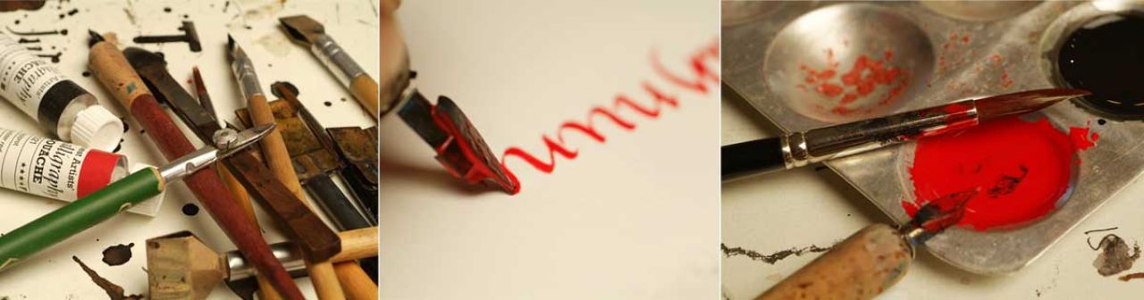 Schreibgeräte (z.B. Federn, Pinsel, Balsaholz, Automatic Pens etc.), Schreibflüssigkeiten (Tusche, Beize, Gouachefarben), zum Farbenmischen (Farbpalette, kleine Gefäße, Pinsel), Papier (z.B. Vorsatz-, Zeichenpapier), Buchbindewerkzeuge (Schere, Cutter, Stahllineal, Schneidematte, Falzbein, Ahle etc.) Die benötigten Materialien werden zum größten Teil auch im Kurs zur Verfügung gestellt bzw. zum Verkauf angeboten.
